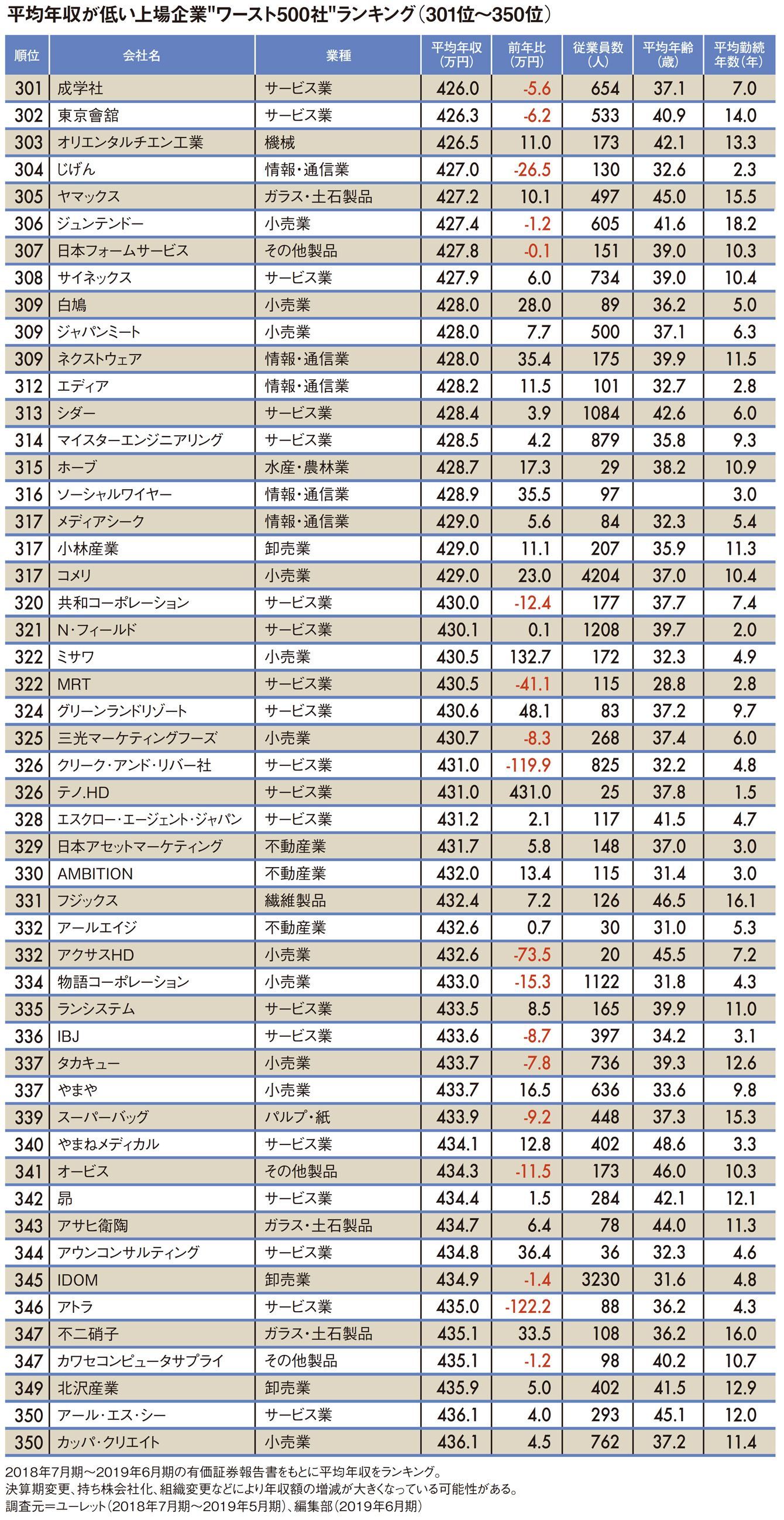 平均年収が低いワースト500社ランキング2019