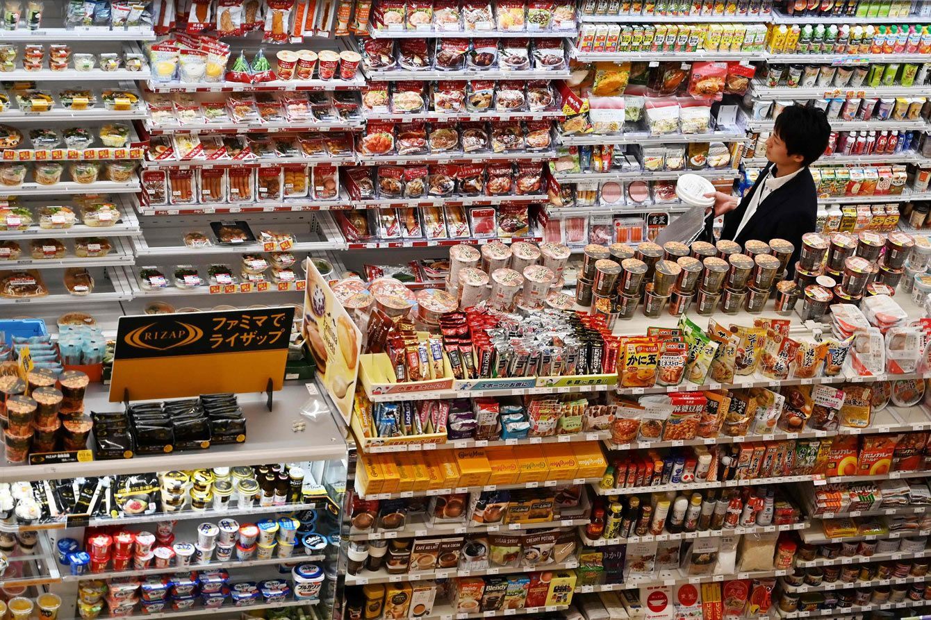 東京のコンビニエンスストアを訪れる男性=2019年5月20日
