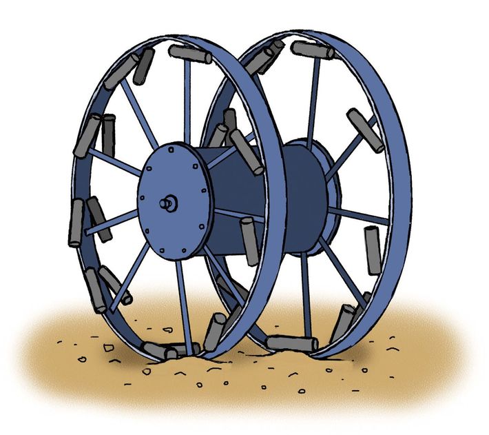 1940年代にイギリスが開発した「走る爆弾」、パンジャンドラム。車輪に張り付いている筒状のロケットで動くが……。