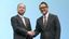 共同記者会見で握手するトヨタの豊田章男社長(右)とソフトバンクグループの孫正義会長兼社長=2018年10月4日、東京都内のホテル