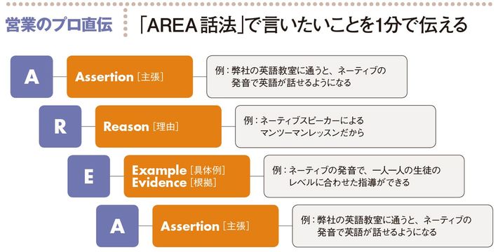 まず主張(A)を述べてから、理由(R)を言う。そして、具体例もしくは根拠(E)で説得力を持たせ、最後にもう1度、主張(A)をする方法。営業だけでなく会議などいろいろな場面で使える技術だ。この方法で、自分の主張を1分以内で言えるように準備しておこう。