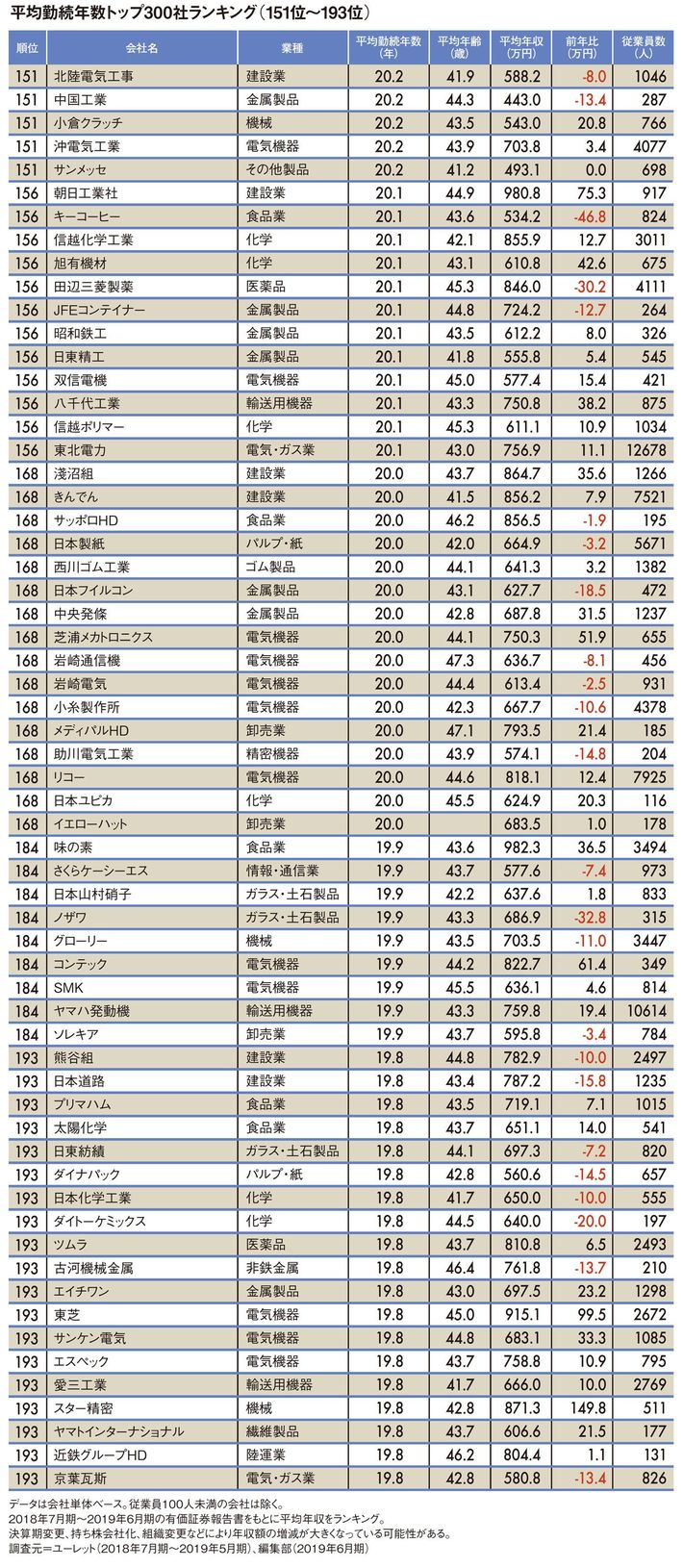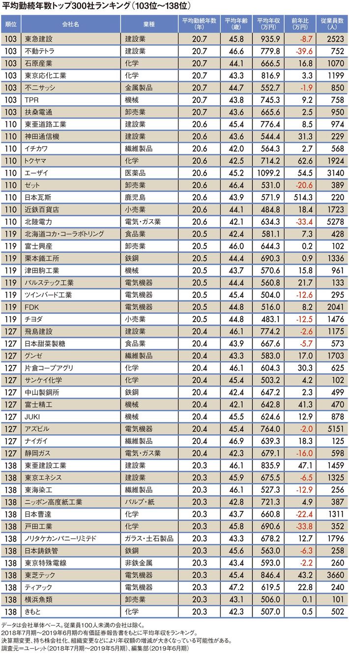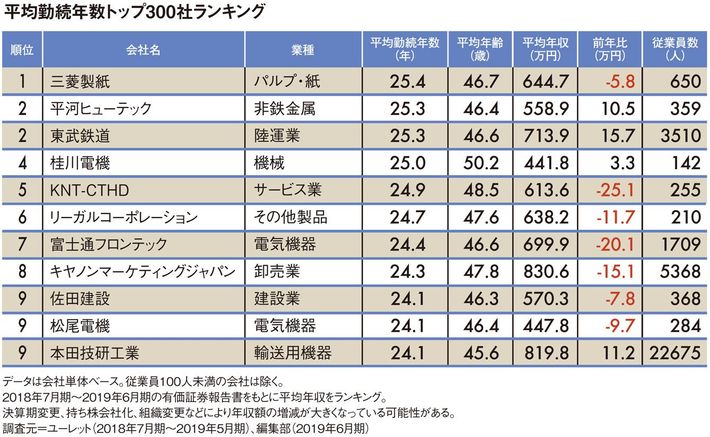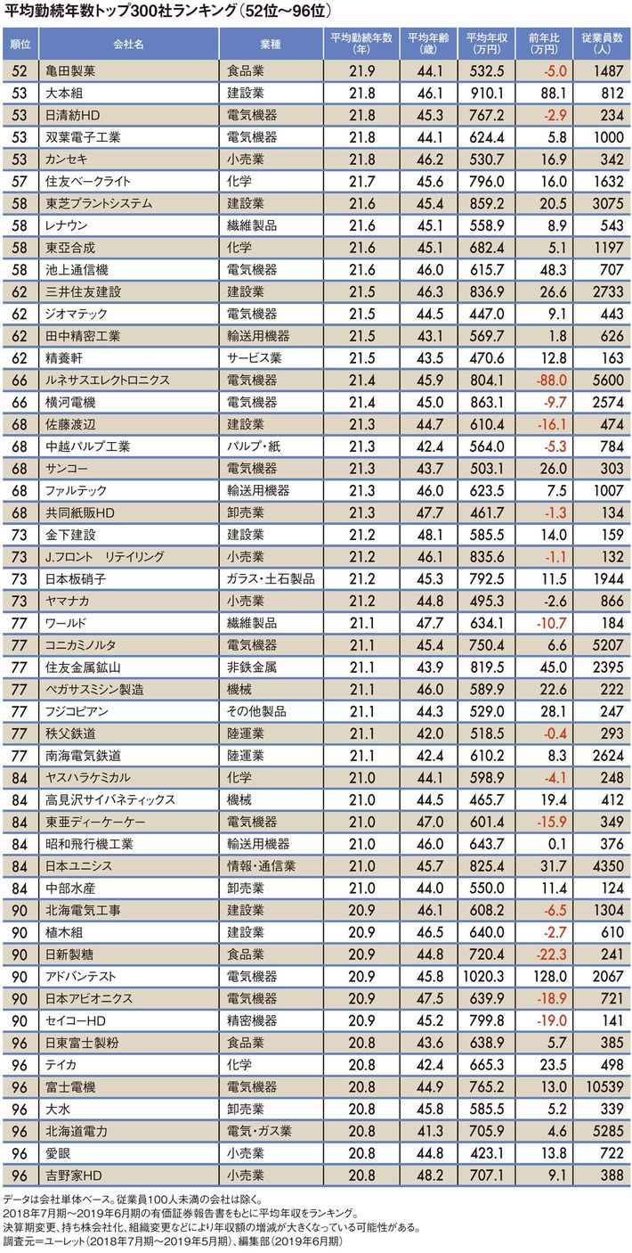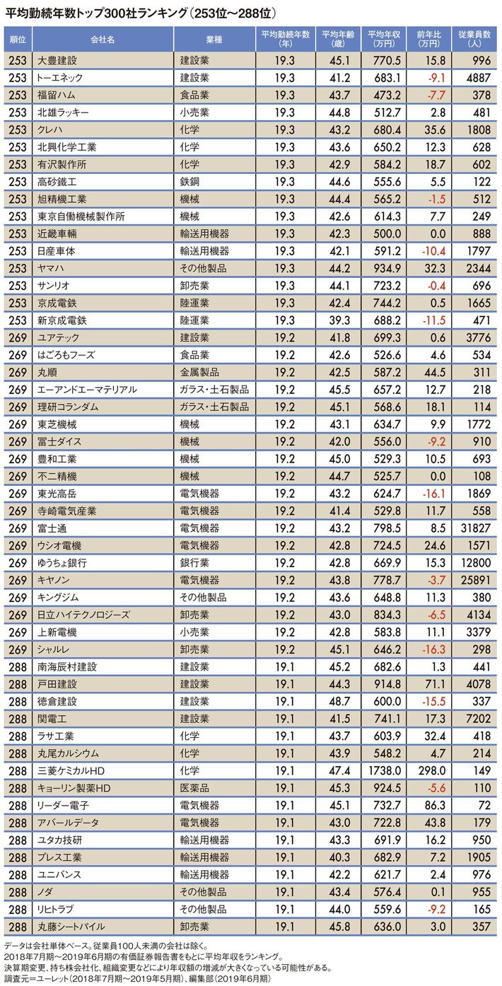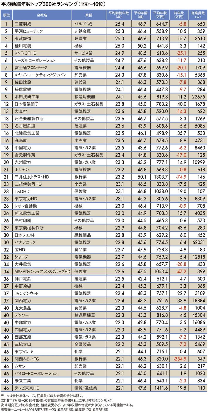 平均勤続年数"トップ300社"ランキング2019