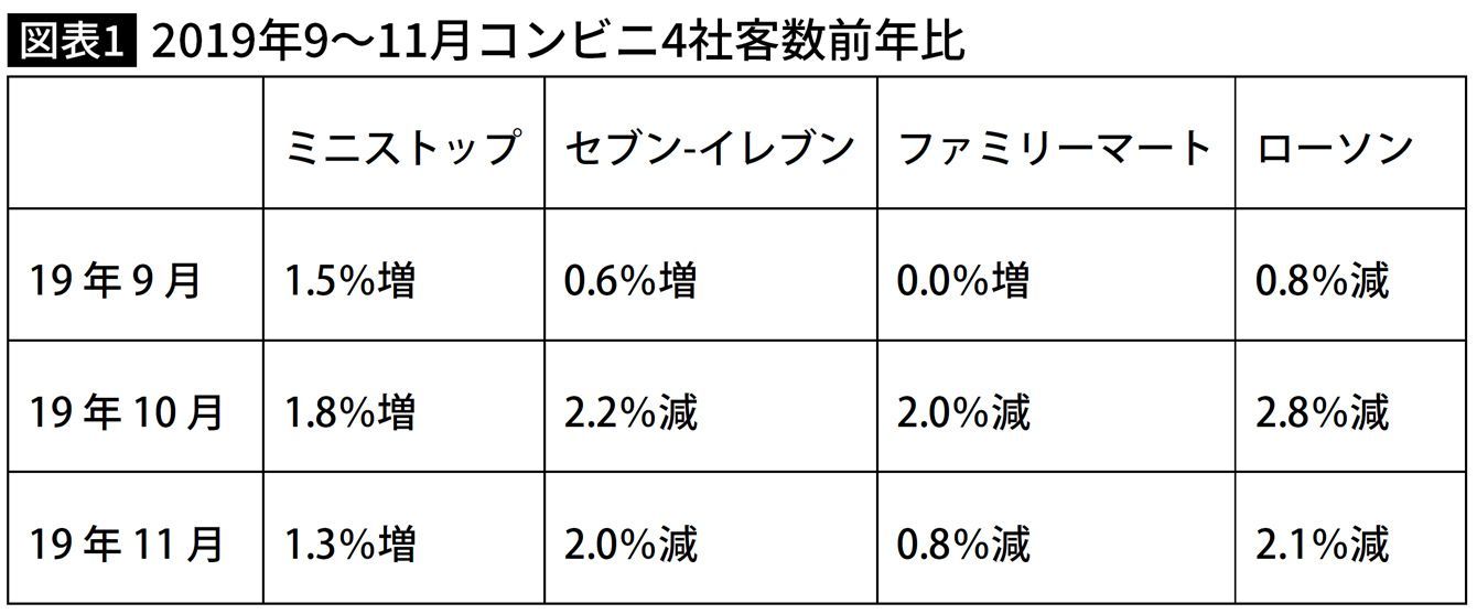 2019年9〜11月コンビニ4社客数前年比(プレジデントオンライン編集部作成)