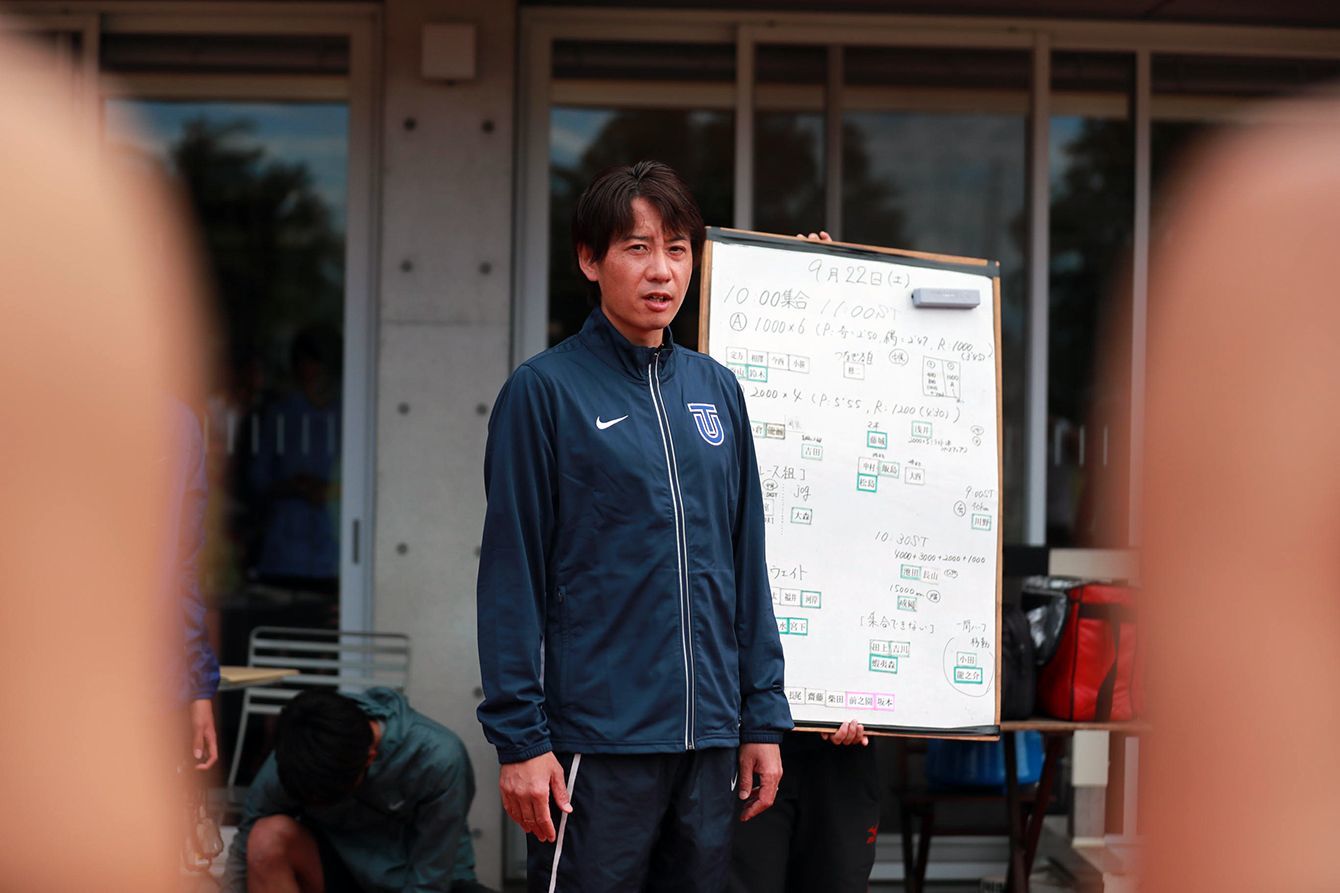 練習の前にはその日の練習メニュー、ペース設定、注意事項などを説明。練習の目的を選手たちに理解させることも大切