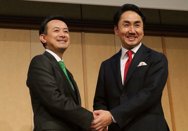 ZHDの川邊健太郎社長(左)とLINEの出澤剛社長(右)(2019年11月18日)。(毎日新聞社/アフロ=写真)