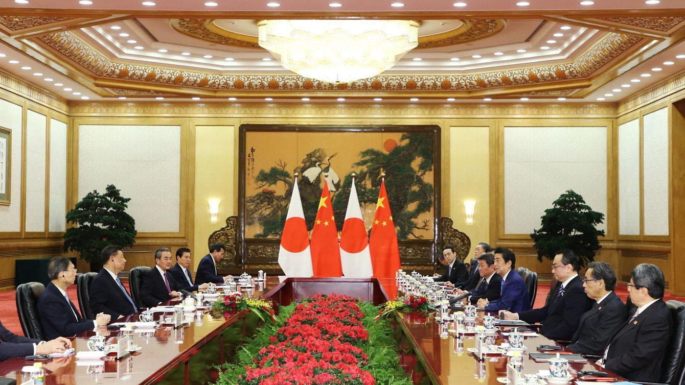 中国の習近平国家主席(左手前から2人目)と会談する安倍晋三首相(右手前から4人目)=2019年12月23日、中国・北京の人民大会堂