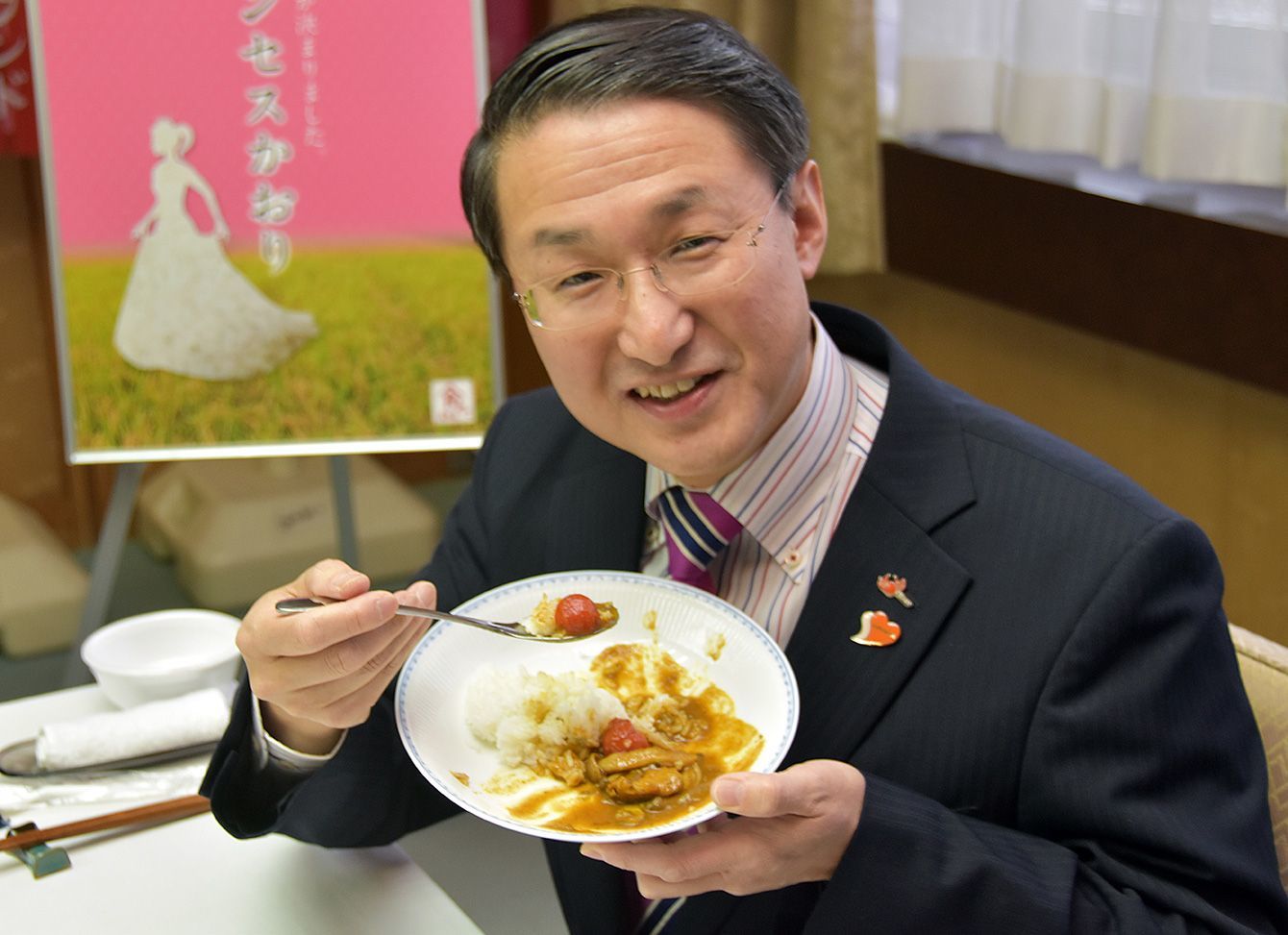 新品種のコメ「プリンセスかおり」でカレーを食べる鳥取県の平井伸治知事=2017年12月19日、鳥取県庁