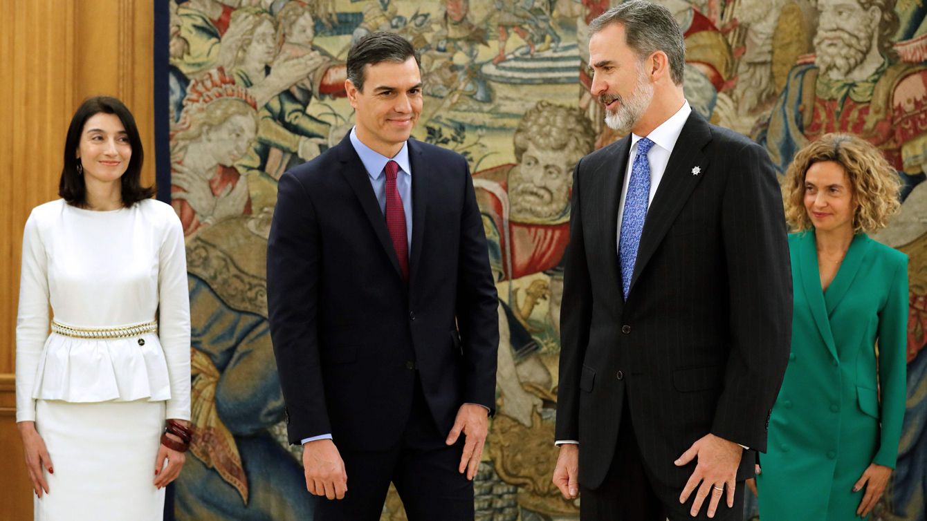 再選したペドロ・サンチェス首相(中央左)と、フェリペ6世スペイン国王(中央右)。2020年1月8日、マドリードのサルスエラ宮殿にて。スペインで初となる急進左派との連立政権となった。