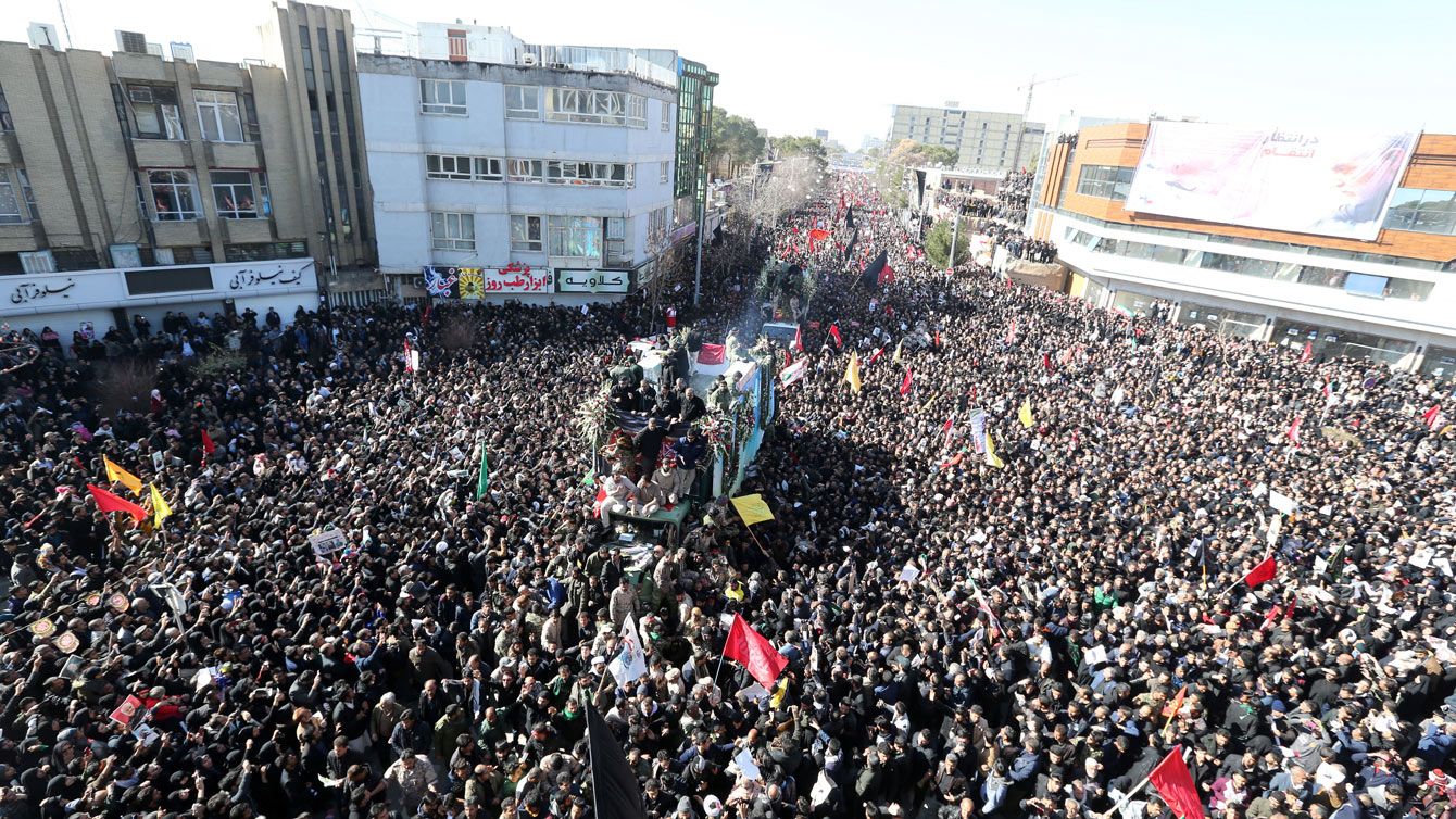2020年1月7日、イラン南東部ケルマンで、ソレイマニ司令官のひつぎの周りに集まる人々(イラン・ケルマン)