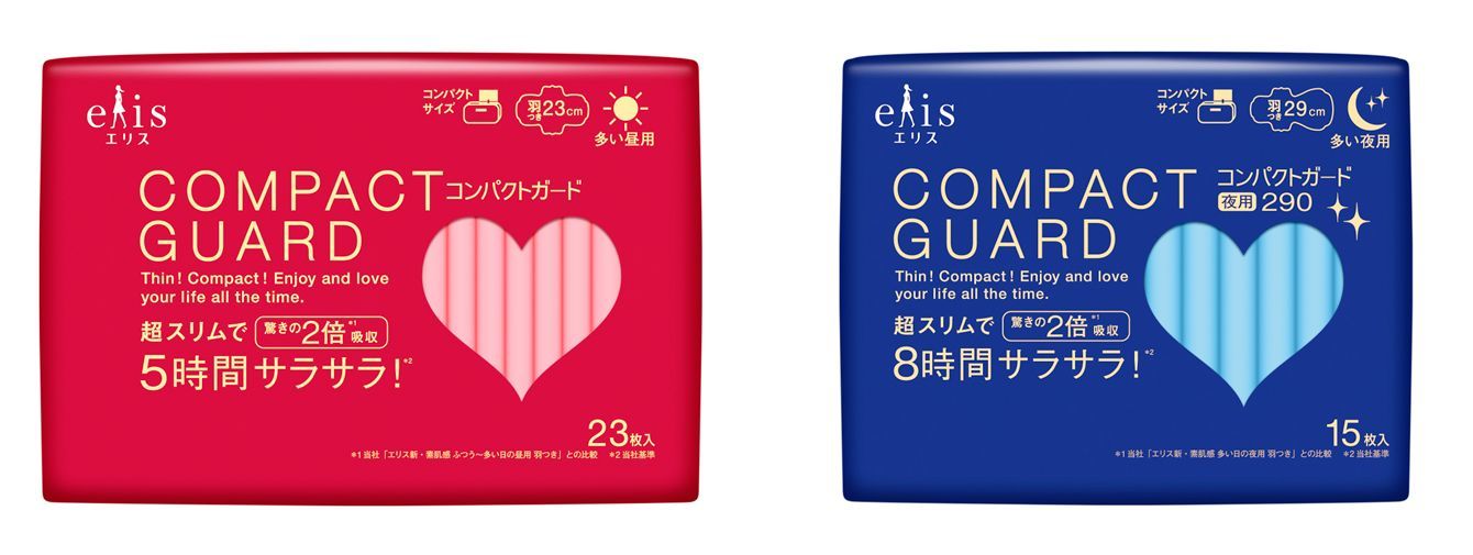 「エリス コンパクトガード(多い日昼用 羽つき23cm)」(左)、「エリス コンパクトガード(多い日夜用 羽つき29cm)」(右)