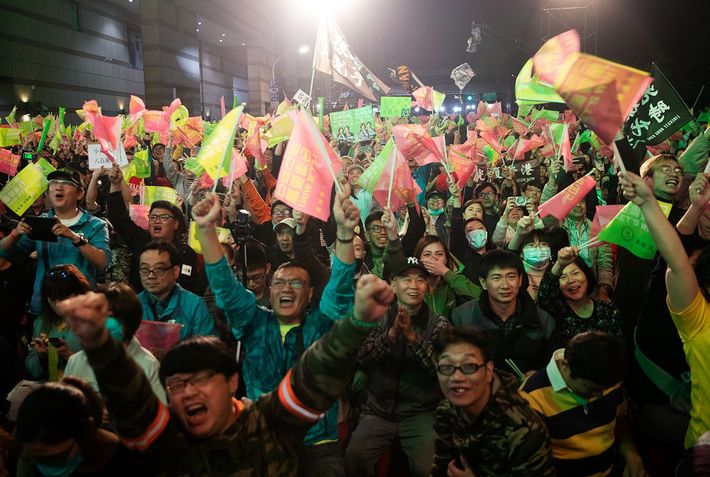 1月11日の総統選挙で、中国共産党政府と一線を画す現職の蔡英文氏が再選されたことを喜ぶ支持者たち(2020年1月11日、台北)