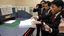 大型シュレッダーで招待者名簿に見立てた紙束を細断する、野党の桜を見る会追及本部のメンバー=2019年11月26日、内閣府地下1階