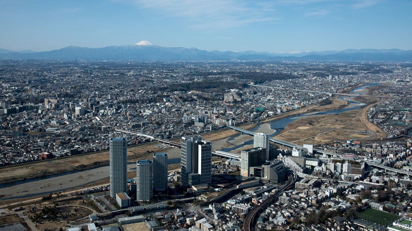 二子玉川駅周辺と多摩川より富士山(東京都世田谷区)