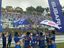 スタンドのファンに手をふる中村社長(中央)