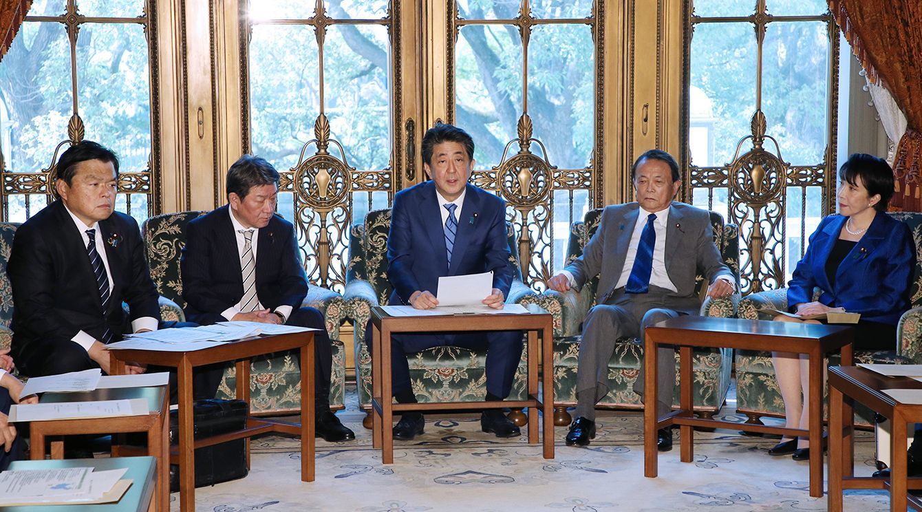 新型コロナウイルス感染症対策本部で発言する安倍晋三首相(中央)=2020年1月31日、国会内