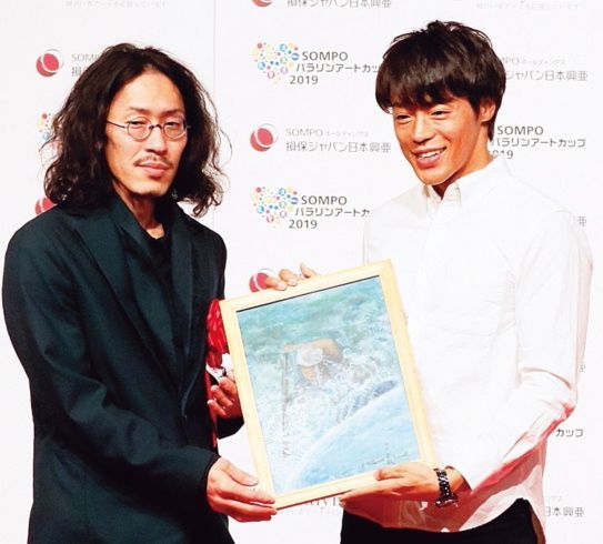 障がい者自立推進機構主催の「SOMPOパラリンアートカップ2019」表彰式に、ゲストとして登壇する羽根田選手。競技生活の合間を縫い、社会的な活動にも熱心に取り組む。
