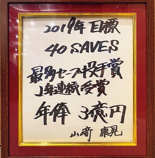 山﨑選手が2018年の年末に記した色紙。掲げた目標に対して、19年はセ・リーグで唯一となる30セーブを挙げ、2年連続の最多セーブ投手賞を獲得。20年の年俸は3億5000万円(推定)。球団から高い評価と厚い信頼を得る。