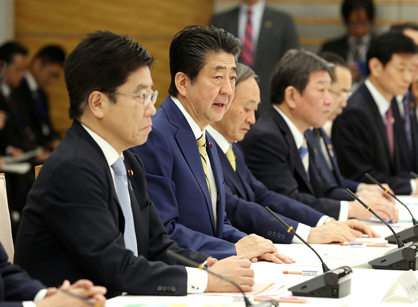 新型コロナウイルス感染症対策本部であいさつする安倍晋三首相(左から2人目)=2020年2月1日、首相官邸