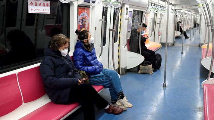 2020年2月2日、人がまばらな北京市内の地下鉄でマスクを着ける乗客(中国・北京)