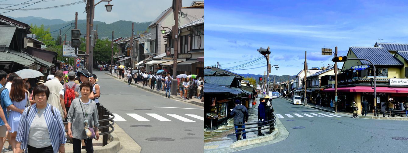 嵐山のメインストリート(2018年夏)と現在(2020年2月)