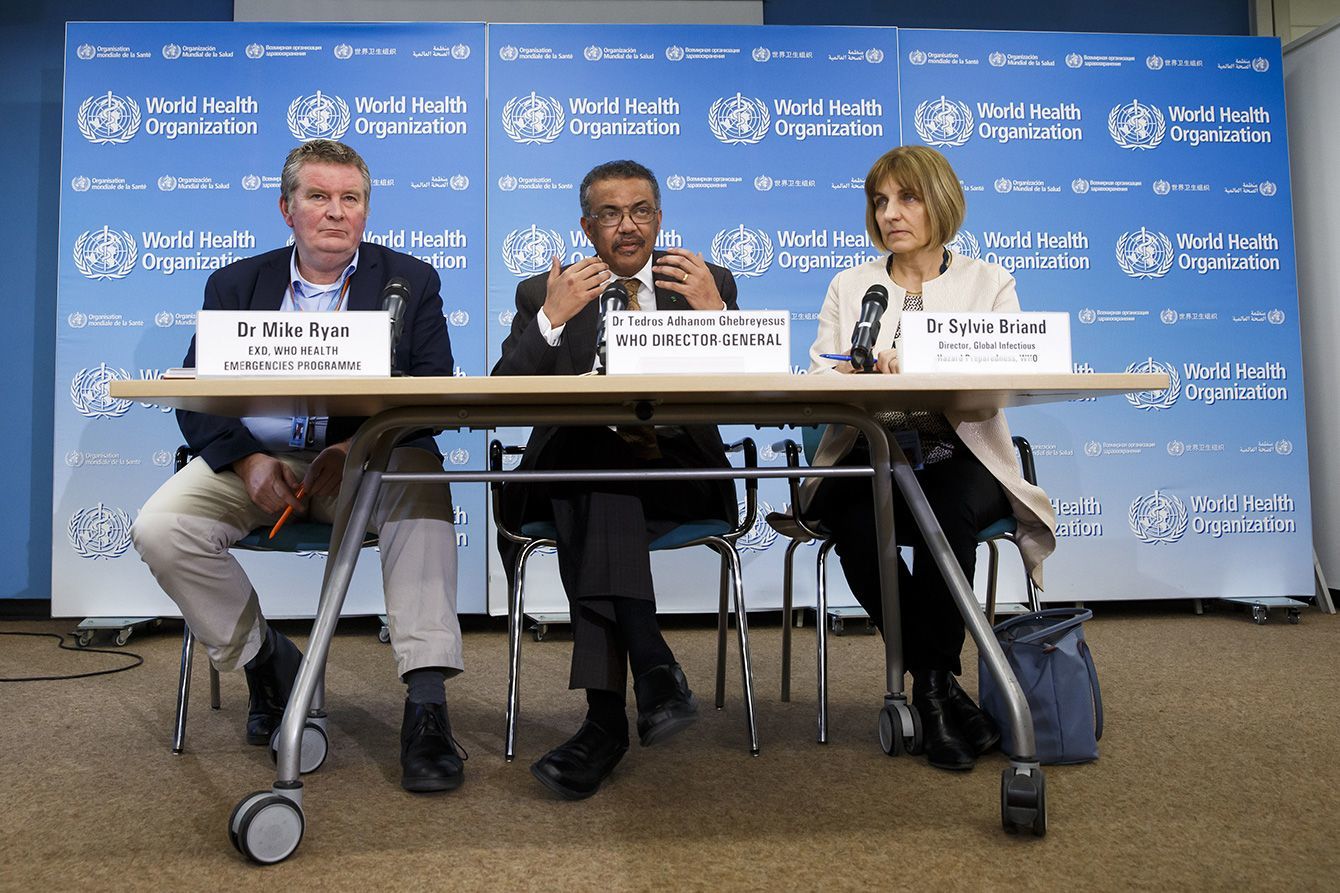 記者会見に応じる世界保健機関(WHO)のテドロス事務局長(中央)