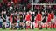 3位決定戦・ニュージーランド対ウェールズ。健闘をたたえ合うウェールズ(赤いユニホーム)とニュージーランドの選手=2019年11月1日、東京スタジアム