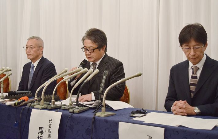 子会社をめぐる不適切な会計処理について記者会見するエフエム東京の黒坂修社長(中央)ら=2019年8月21日、東京都千代田区の同社本社