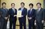 自民党の岸田文雄政調会長(左から2人目)らから新型コロナウイルス関連の提言を受け取る安倍晋三首相(同3人目)=2020年3月3日、首相官邸