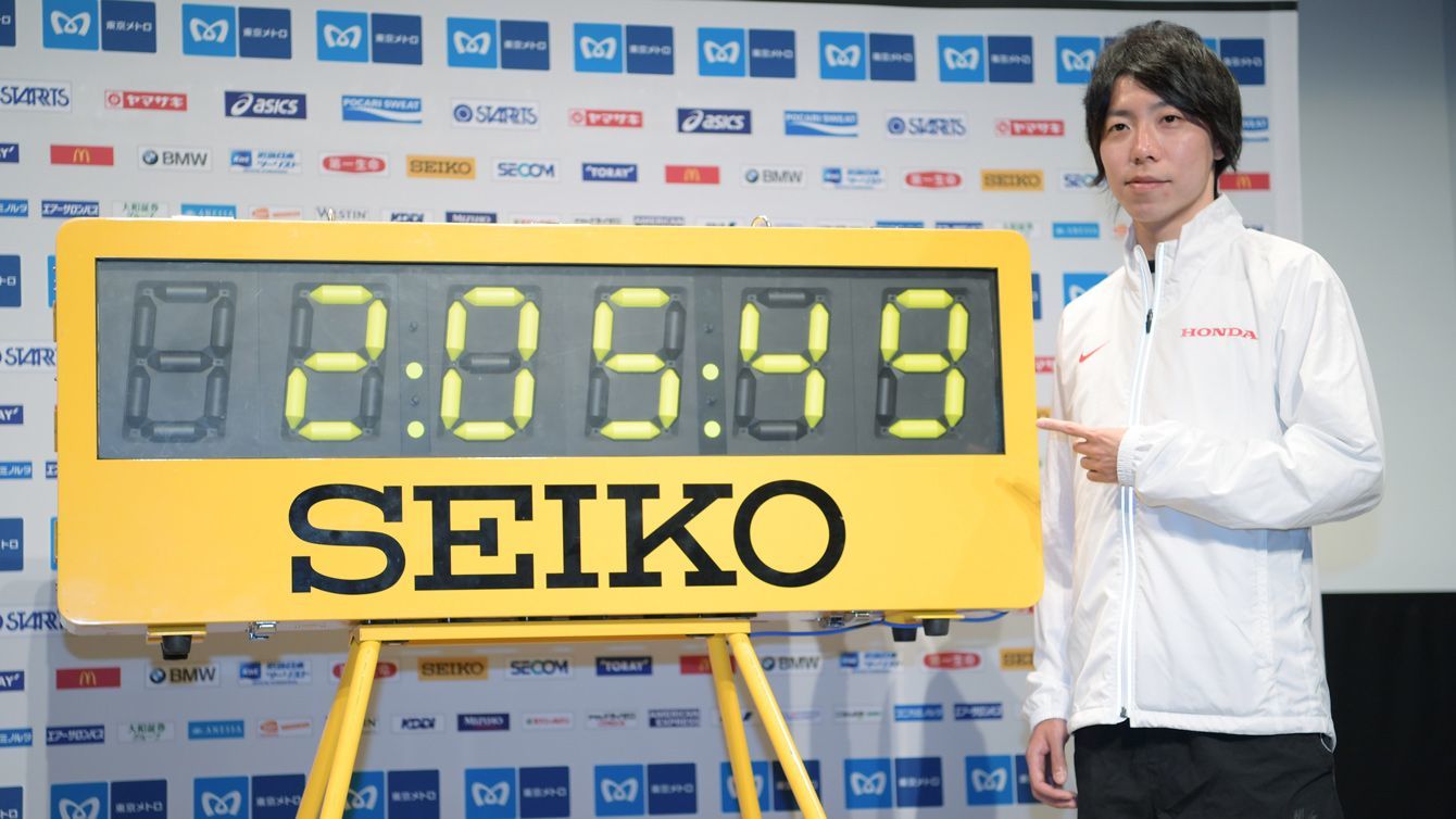 東京マラソンの記者会見で、男子マラソンの日本記録更新に向けて意気込む設楽悠太(ホンダ)=2020年1月28日、東京都港区