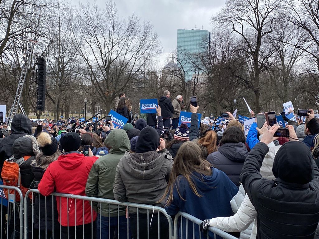 2月29日、マサチューセッツ州ボストン市中心部にある公園「ボストン・コモン」で行われたバーニー・サンダース候補の演説会。主催者発表で約1万3000人が集まった。