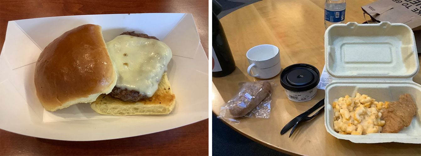 (左)ハーバード大学の食堂で出てくるハンバーガー(6ドル)。(右)ハーバード大学から歩ける範囲にあるスーパーで求めた夕食。卵と肉の揚げ物(7ドル)、カップスープ(4ドル)、パン(1ドル)で、全体で約12ドル。水は職場でペットボトルに移せば無料。