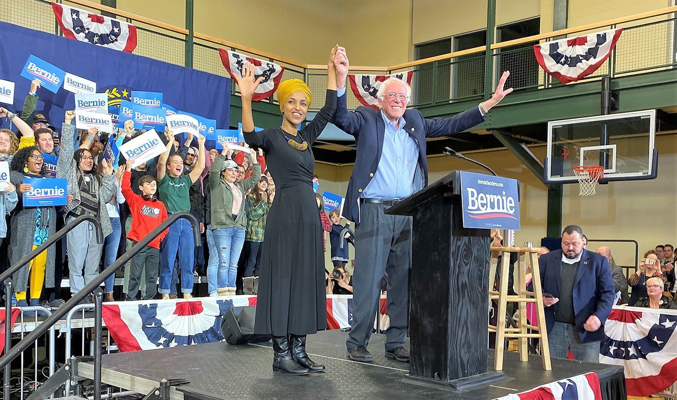 イルハン・オマル下院議員の手を取るサンダース候補。