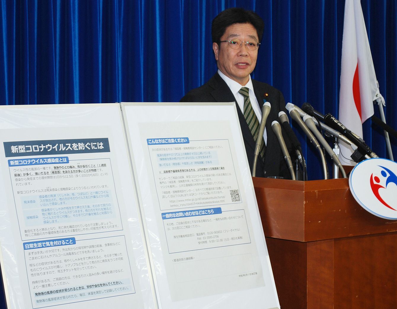 記者会見で新型コロナウイルスの相談・受診目安を公表する加藤勝信厚生労働相=2020年2月17日、東京・霞が関の同省