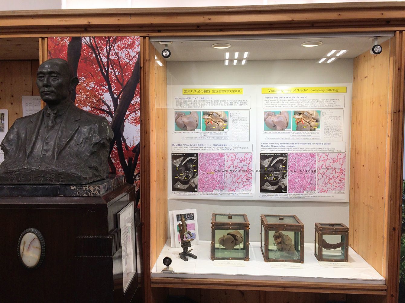 東京大学農学資料館にあるハチの臓器。左の銅像は上野博士