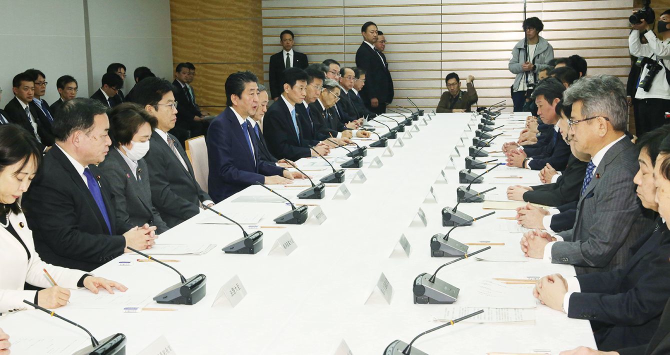 新型コロナウイルス感染症対策本部の会合で発言する安倍晋三首相(左手前から5人目)=2020年3月7日、首相官邸