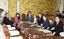 新型コロナウイルスの感染拡大を受け、会談に臨む安倍晋三首相(左から3人目)、公明党の山口那津男代表(右から3人目)、社民党の福島瑞穂党首(左から2人目)ら=2020年3月4日、国会内