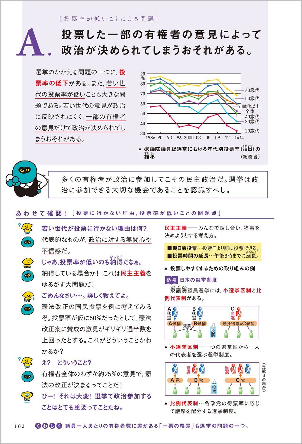 『わけがわかる』シリーズ。ページをめくると、投票率の低さという入り口から、選挙に行かない理由や選挙制度の仕組みを幅広く解説。