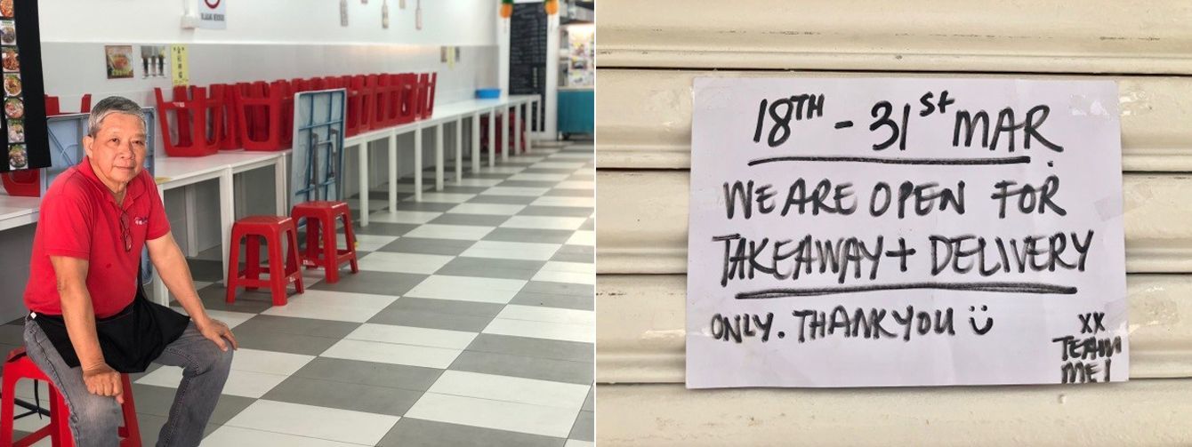 (写真左から)店内での飲食は厳しく制限されるため、テーブルと椅子をすべて片付け、持ち帰り注文の客を待つ中華料理店の経営者。3月18日からの2週間、「持ち帰りか宅配には応じます」とシャッターに掲げていた飲食店。完全に閉店すると収入は途絶えてしまう
