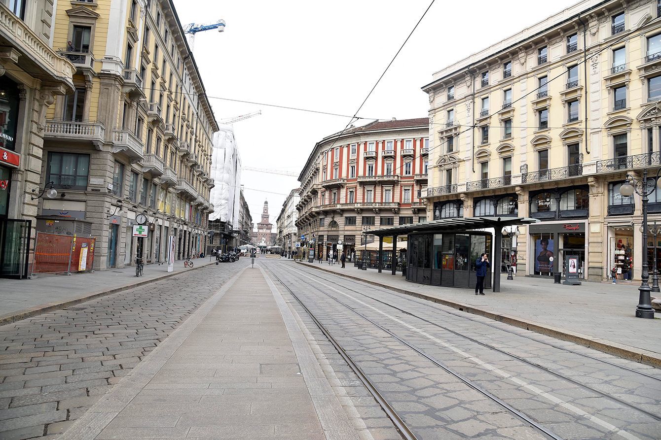 3月8日の「隔離地域」指定や10日からの全国的な移動制限で、閑散としたミラノ中心部=2020年3月9日