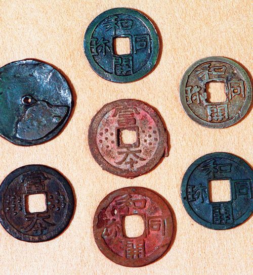 無文銀銭は左上、富本銭は中央と左下。それ以外には和同開珎と表記されている。(AFLO=写真)