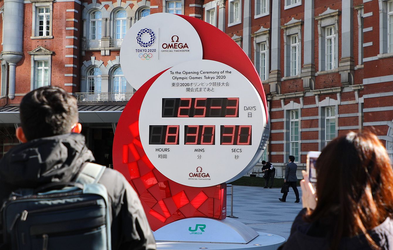 カウントダウンを一時中止し、現在時刻を表示する東京五輪のカウントダウン時計=2020年3月25日午前、JR東京駅前