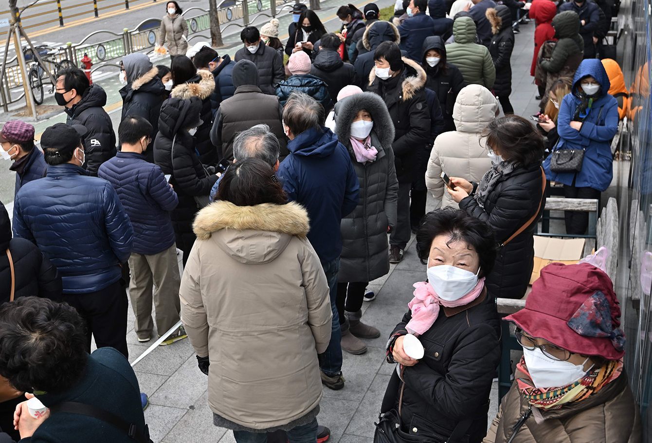 マスクを買うために並んでいる人たち=2020年3月4日(韓国・ソウル)