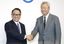 資本業務提携を発表し、握手するトヨタ自動車の豊田章男社長(左)とNTTの澤田純社長=2020年3月24日、東京都千代田区