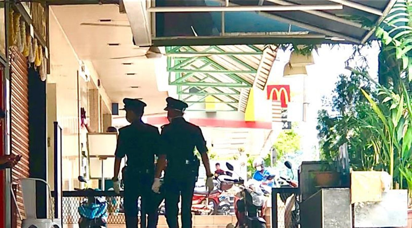 マレーシアの首都クアラルンプール市内で警戒にあたる警察官。活動制限令下で飲食店が営業していないかなど厳しく取り締まりがされている状況だ