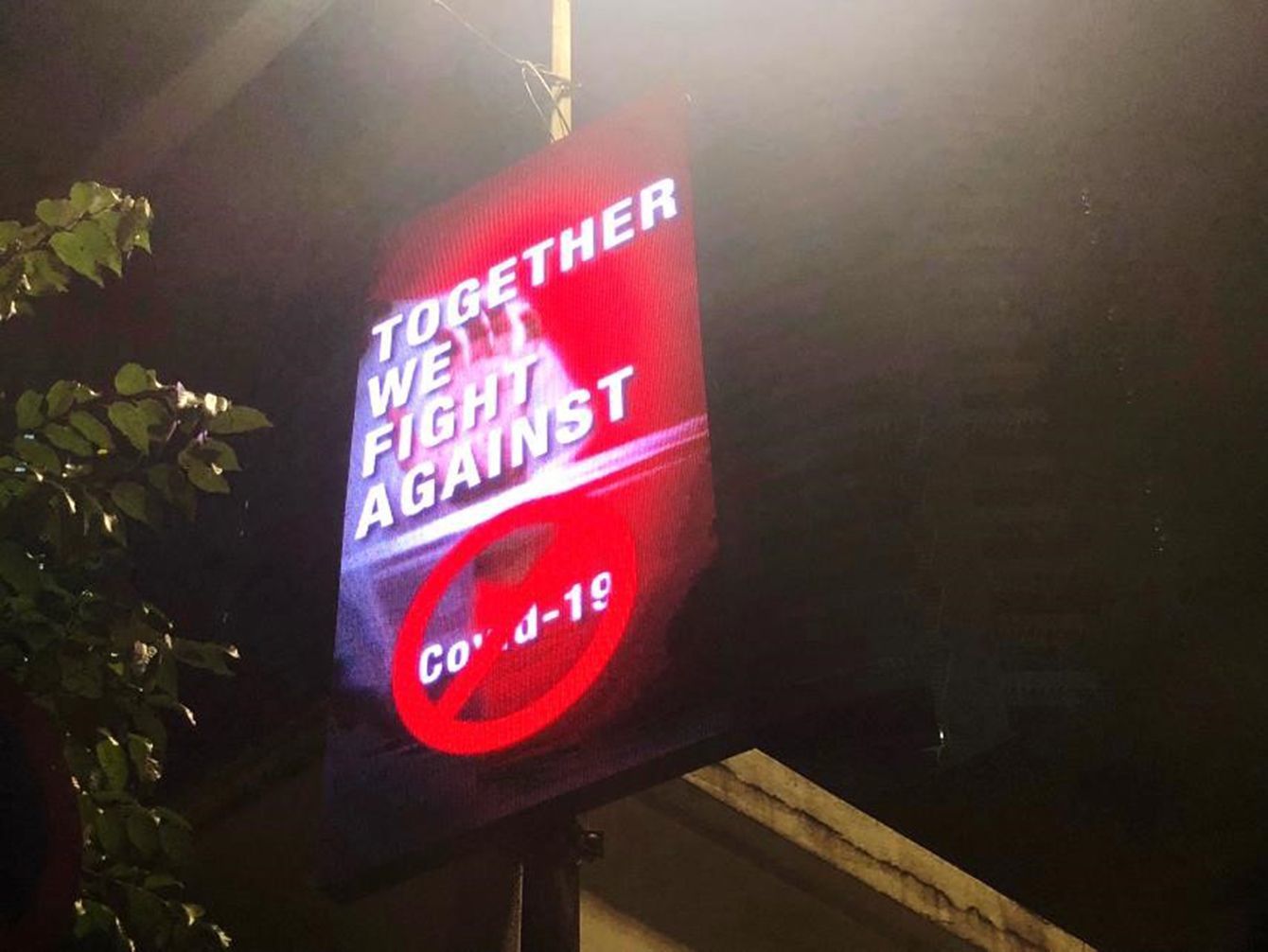 マレーシア国内では至るところに電光掲示板で「Covid‐19に共に立ち向かおう」など、国民の団結を求める告知が見られる