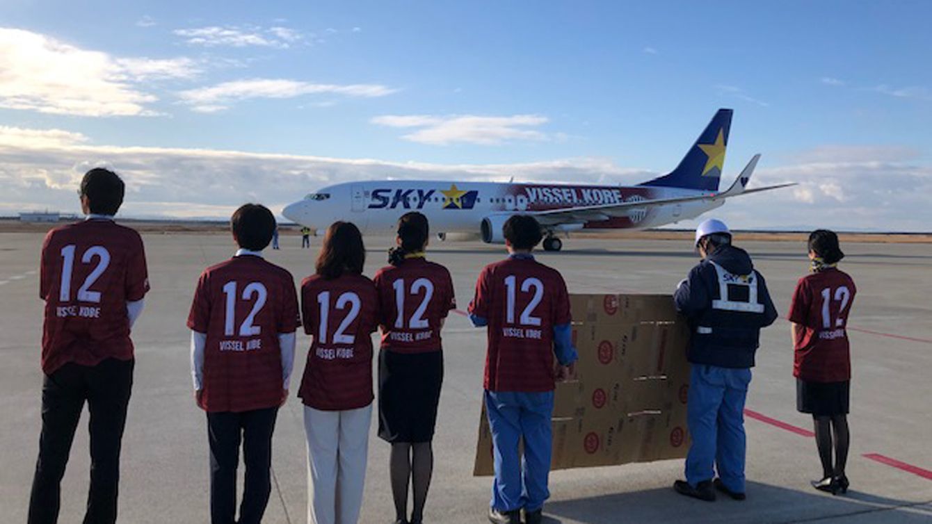 ヴィッセル神戸をモチーフにしたラッピング機「ヴィッセルジェット」。2019年5月14日~2020年12月ごろまで、全路線を飛んでいる。