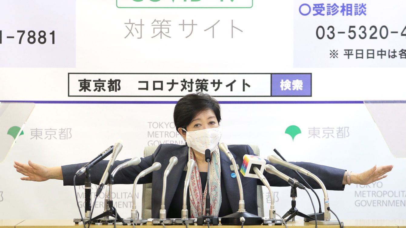 記者会見で両手を大きく広げる東京都の小池百合子知事=2020年4月7日夜、東京都庁