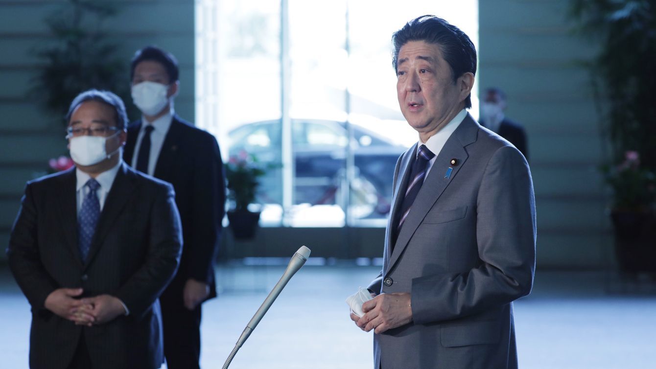 新型コロナウイルスの感染拡大に伴う緊急事態宣言発令から一夜明け、記者団の質問に答える安倍晋三首相(右)=2020年4月8日、首相官邸