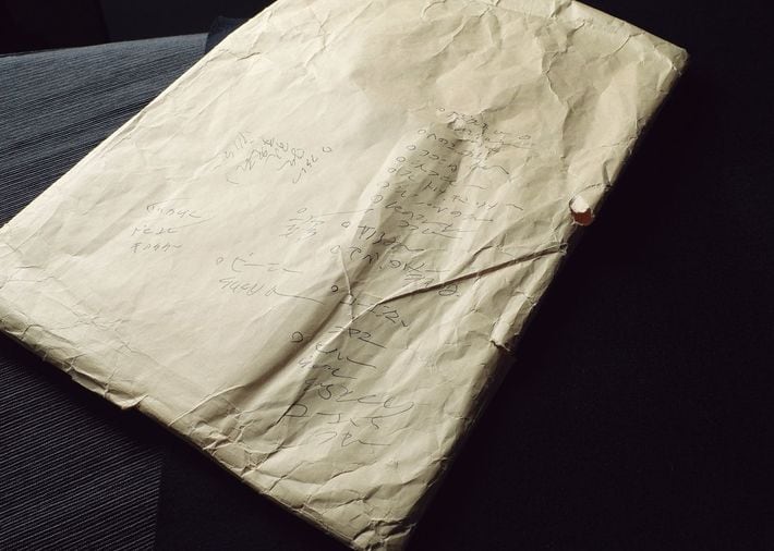 かばんを持たない田原氏にとっては封筒がかばん代わりだ。封筒が破れて使えなくなる前に、メモで表面が埋まってしまうのが常。約2週間ほどで新しいものに替えるそうだ。