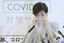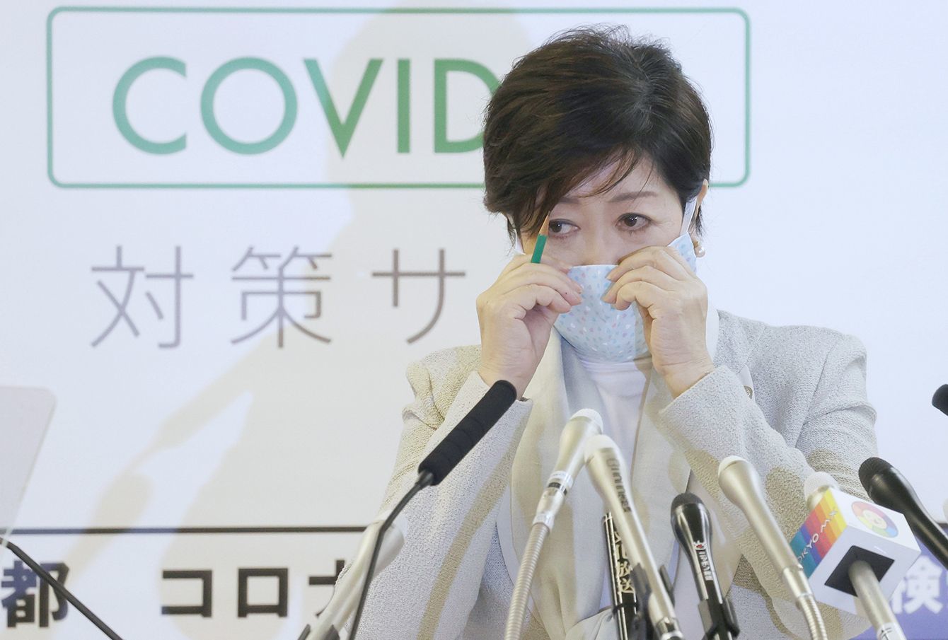 記者会見中にマスクを触る東京都の小池百合子知事=2020年4月10日、東京都庁